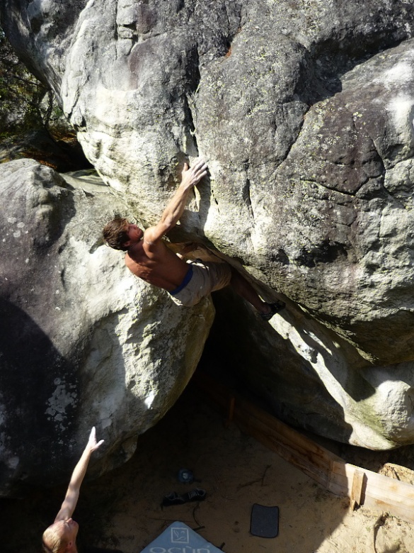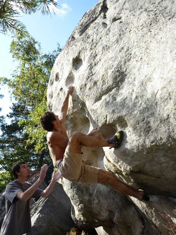 během ME v Paříži jsme si nemohli neodskočit alespoň na jeden den do Fontáče. Lezli jsme v sestavě Helča Lipenská, Kuba Hlaváček, Martin Stráník, Petr Resch a velmi malinko Tomáš Mrázek, kterého druhý den čekalo semifinále a finále na obtížnost. Největším tahounem byl Martin, který tu byl poprvé a stihl během toho dne nasázet několik sedmiček, nejlepším výkonem byl bezesporu famózní Big Boss za 7C+ (podle mě jasný adept na TOP BOULDER) a pak ještě rychlovka v Noir Desiré za 7C.