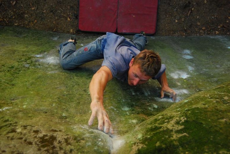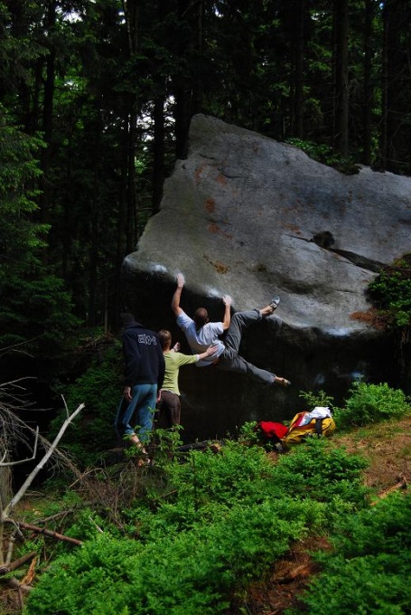 Ostatní nacházím pod Poemexem, kde probíhá opět ona zmiňovaná snaha:). Následuje přesun znovu pod Monstrum, stavuji se ještě na ?(doplnit). Z lesa vidím Jirku stát nahoře – zas to poslal z 1. bomby (Godzillu). Já to po chvilce taky nějak přehrotím – viděl bych to na těch 7B+. Nepřijemnou tečkou je Jardův pád z už lehkého dolezu, po kterém se špatně převalí na matraci a vyhodí si meniskus, který žel nejde vůbec nahodit. Pomocí berel pak začíná pajdat k autu. Jirka tu ještě vyzkouší King Konga, kterej mu jde docela pěkně (proskočil dirku). Já chytám a čekám, kdy mě tahle věc začne motivovat:). Pak nějaky zdvihy zadku v Shortcat a domů.