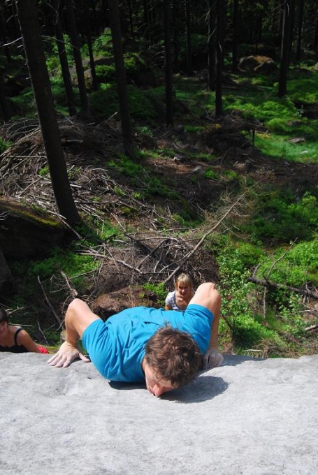 Druhý den - klasika – vstáváme asi o dvě hodiny později než v sobotu. Ve spodním sektoru Katka přebuší ze soboty nacvičeného Hrcáka. Pak se chvíli válíme mezi mravenci – konečně padnul Mravkolev. Já si tu pobudu o trochu déle – zkouším do Mravkolva traverz – dlouhé, ale pěkné a půjde to:). Někdy:).
