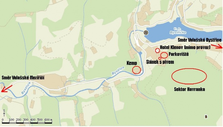 Takže...kemp těsně pod hrází, cca 1 km od parkoviště (viz. poslední mapka) je funkčí. Hospoda v něm taktéž. Cena (což jsem moc nepochopil) je jednotná a to 174,- za osobu. Jednotná znamená, že provoznímu je fuk, jestli spíte v chatce (pro čtyři) v deseti , na trávě, na "hajzlu" nebo v blitkách pod stolem před výčepem... Je tam hygienické zařízení atd. jak to v kempech obvykle bývá.