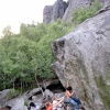 Při té příležitosti se zadařilo jedno krátké odpolední lezení na Modříně, kde se jim moc líbilo a Davidovi se povedl 2. přelez boulderu “Hampi style SD” (jiný než A.O. přelez mi není znám). David zdolal spodní kroky už v druhém pokusu, ale pak se trochu trápil s vrchní pasáží, z čehož mi hlava nebrala :-) K obtížnosti se nechtěl moc vyjadřovat, ale řekl že je to asi 8A.... Téměř za soumraku pak probíhaly pokusy v novém projektu, který si David našel. Nicméně plotna ve velmi nepříznivých podmínkách nepustila a tak se přelez odkládá na další návštěvu, jež bude pravděpodobně brzy, takže se máme na co těšit :-)