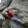 Dáváme si sraz v 9h ve Slatiňanech s Honzou Chválou, rozlézáme se v okolí Kazatelny, Honza seká jeden boulder za druhým, my s Marťou opakujem pár starších věcí, fotka z již vylezené Mucholapky 8A+, z jebky morfo skok do článkové lišty.