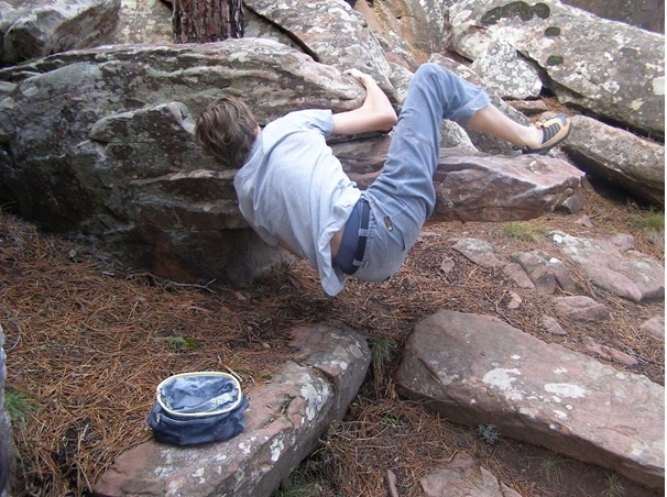 Materiál je zde písek zbarvený do hnědočervené barvy. Velké množství bouldrů jsou po oblinkách, ale nechybí tu samozřejmě ani malé lišty a oblíbené madla ve stropech. Co se týká profilů, tak lezete buď téměř v totálním nebo částečném stropu nebo v kolmicích až v mírném převisu. Klasické tréninkové 45stupňové převisy jsme tu moc nepotkávali.