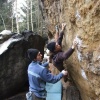 Jdeme dál na Tonicu 7C, nádherný a logický traverz, začátek lehký pak nateče a krutě těžký konec, který nechápem nikdo, těžko se nám to daří zkrokovat. Po Tonice jdem objevit sektor Fuck a Vilda s Čížou nalézají, cestou potkáváme pár krásných boulderů až příjdem přímo do Fucku. Čížovi se podaří dát Fuck 7B+ a my s Vildou zkoušíme prodloužení za 7C. Je to trochu vlhký a střílí to, mě se zadaří a po chvilce dávám, Vildu motivuju jak můžu i nějakými legračními kecy, bojuje a nakonec dojede prý , že není vytrvalost, škoda určitě si dnes vybral smůlu, protože ke dvěma přelezům, měl hodně blízko. Cestou zpátky se ještě stavíme úplně na začátku, kde je velký převis, kluci lezou do 7A a já se zakousnu do 7C+, začátek madla, pak dlouhý nátah do oblých dvou lišt a silový konec, říkám si něco pro mě, to by mi mohlo sedět, jde mi to dobře, škoda, že je to vlhký a na poslední krok už prostě chybí síla, skoro za tmy sejdem k autu a jedem dom. Ješte nás na krušnohorským sedlu, čeká nepříjemný průjezd sněhovou vánicí...