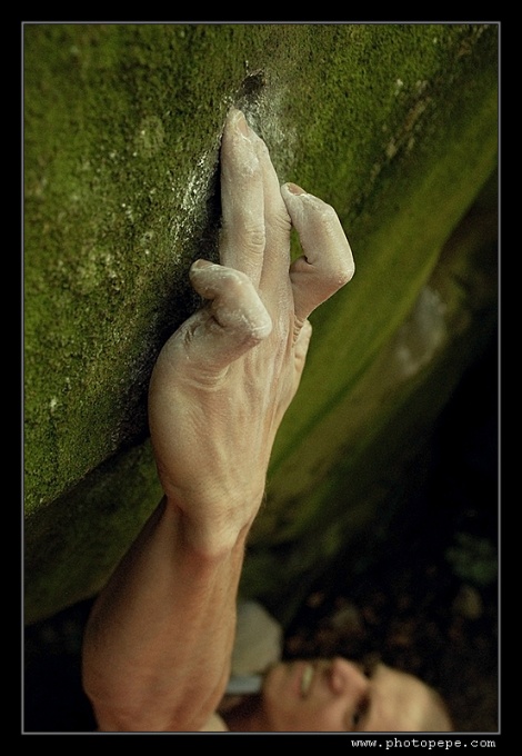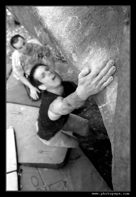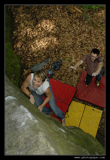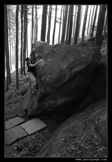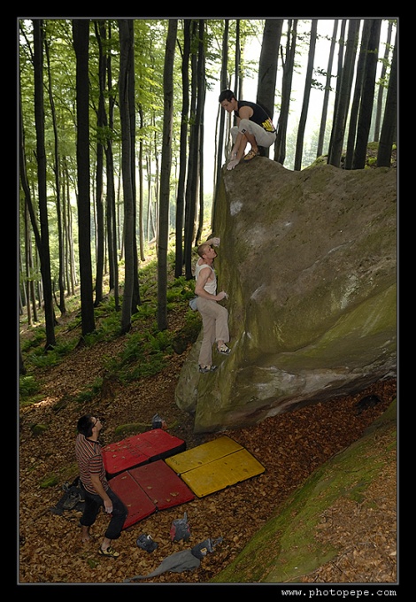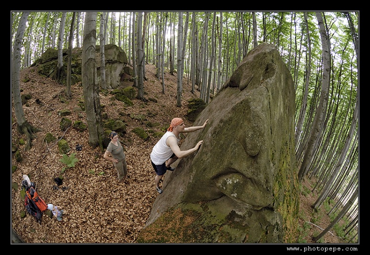 U kiosku se nakonec sjíždí čtyři auta, takže ještě nedávno silnou vrstvou mechu obrostlé pískovcové balvany čeká asi největší nájezd z řad kamenomilců. S patnácti minutovým prudkým kopcem se nejlépe pere nováček týmu, „Tlusťochova" půlroční Matylda, pro změnu z řad ježků, krys, vyder a neposledně klanu Border teriérů. Rozlézáme se v sektoru Havranka, kde i ten zdánlivě největší kvak skýtá pěkné „šukací" pohyby a padá i projektík Měkota v Penově podání. Holky brousí převážně plotny a Kača „Šindelka" demotivuje i část mužské sestavy, když rychle přelézá hezký problémek 100+1. Pupkatý dědek Pepe se ladně prochází ve všem (grrr!), takže snaha jej rychle nahnat do něčeho těžšího není náhodná.