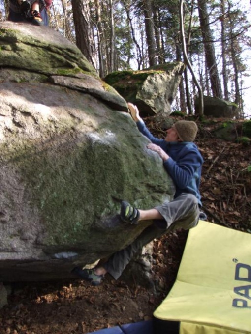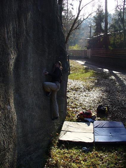 Poslední zastávka je opravdová paráda,  louka, krásné bouldry, jak lehčí tak těžší. Zvlášť bouldr Mňau je fakt povedený – pro mě kandidát TDTB. Kluci zde mají místní nejtěžší projekt a chvilku se v něm s většími či menšími úspěchy trápí. Projekt odolává na příště. Celý den je k nám počasí přívětivé, ale k večeru se začíná zvedat vítr a tak volíme ústup směr bouldrovka u Honzy doma.