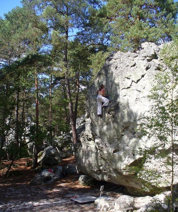 Třetí den hned z rána vyrážíme do méně známé části Apremontu hned přes cestu. Apremont Envers není tak profláklej mezi piknikářema, leží totiž v kopci a tak je zde větší pohoda a klid na lezení. Další 7A – El Passo Droite - pouští docela rychle během dopoledne. Jedná se o střechu s celkem dobrými chyty a problémem ve výlezu. Zuzce se tu moc nelíbí, tak se vracíme a po obědě malinko popolízáme v Bas Cuvier, po menším vztekání přidává Zuzka 6A s konstatováním, že nic těžšího v životě nelezla a že to není možný…Večer už podruhé Potkáváme Paula Robinsna, jak si jen tak mimochodem prohlíží Fatman za 8B v či co to vlastně v šílený střeše vede a já si zatím vylízám pytel z minulých let Big Mama 7A hned vedle…