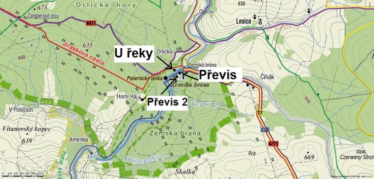 Z Žamberku na Kunvald pak na Bartošovice v Orlických horách a z Bartošovic směr České Petrovice, po pár kilometrech dorazíte na parkoviště před kamenným mostem ( Zemská Brána ), kde necháte auto. K Převisu 1 a 2 přejdete most, dáte se po schodech dolů, po levé straně uvidíte Převis 1, druhý je asi o 100 metrů dále na vrcholku kopečka. K boulderům U Řeky, půjdete asi 300m po proudu řeky Divoké Orlice. Starší lehčí bouldery jsou hned nad tím.