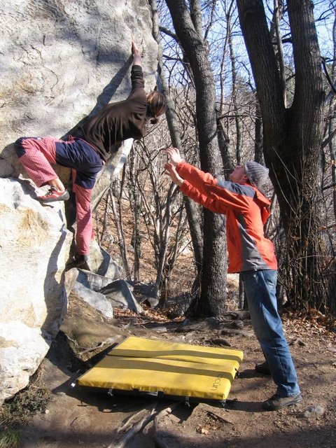 Ze stoje to šlo rychle a teď si sednout a zkusit to ze sedu.Ač se v tom hýbu, dát to v kuse ani prd. Osi nakonec udolává La bulete a konstatuje, že je to krásný boulder. Na ten šutr jsou hezké prostě šecky.