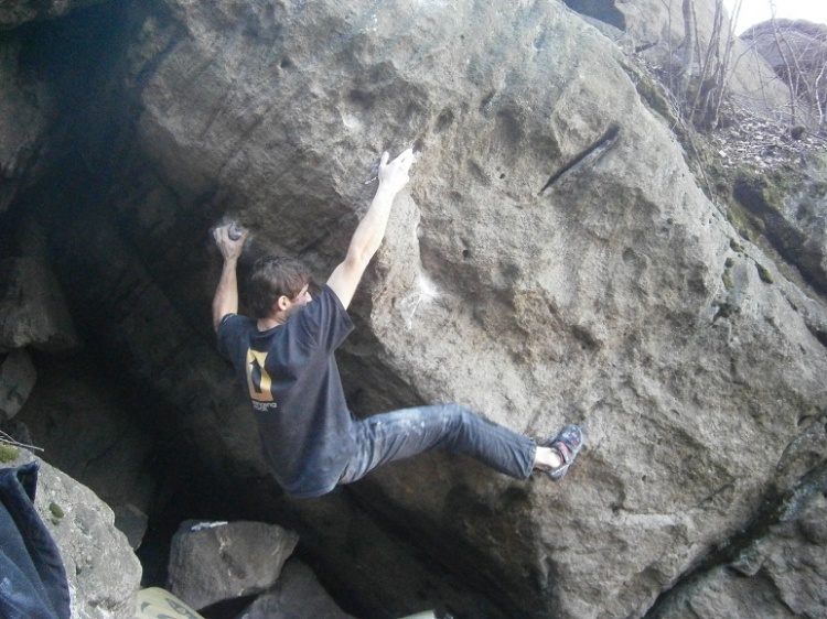 Ke konci dne se mi podařilo ještě přidat nový boulder z druhé strany Trikolory. Škoda, že nešlo nastoupit ještě níže, bohužel zavazí kámen, ale i tak se jedná o parádní převislý kýl, jeden chyt byl mokrý, takže klasifikace je dosti nejistá, Šroubovice DNA je někde okolo obligátních 7B+ - cca 7C.