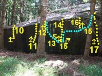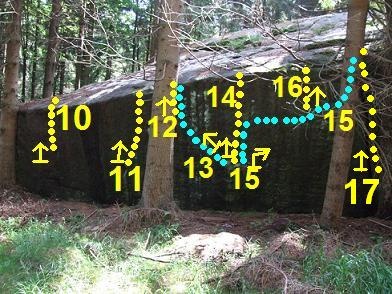 SD 1/2, start z díry pod šipkou, přes dírku doprava do lišt, poté až do spáry a tou na vrchol.