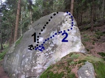 SD, po hraně a přes pár špatných dírek úplně doprava a výlez nahoru. Špatnej dopad, možná 7A+/B.