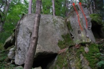 boulder vede na další kámen, na balkonku v pozadí, leze se ze sedu zleva po hraně.