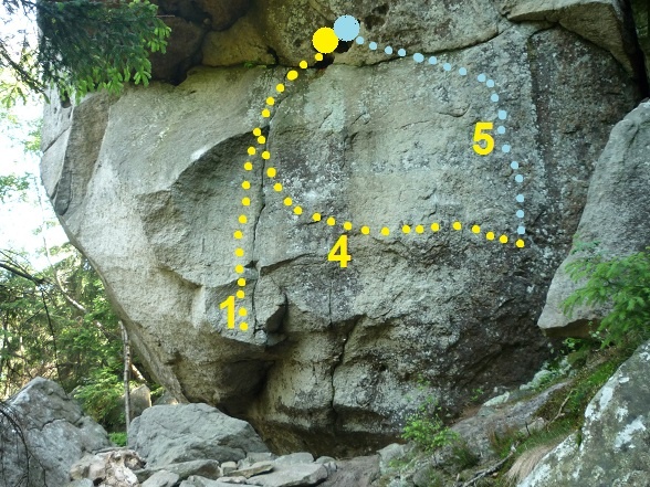 SD, start jako Kony, z něho přes malí lišty doleva do boulderu Silou Nebo Nohou.