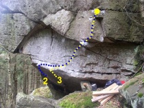 SD, Z dvojprstovky ve stropě, fintovým krokem na hranu a dolez jako Hip Hop. 7A+/7B