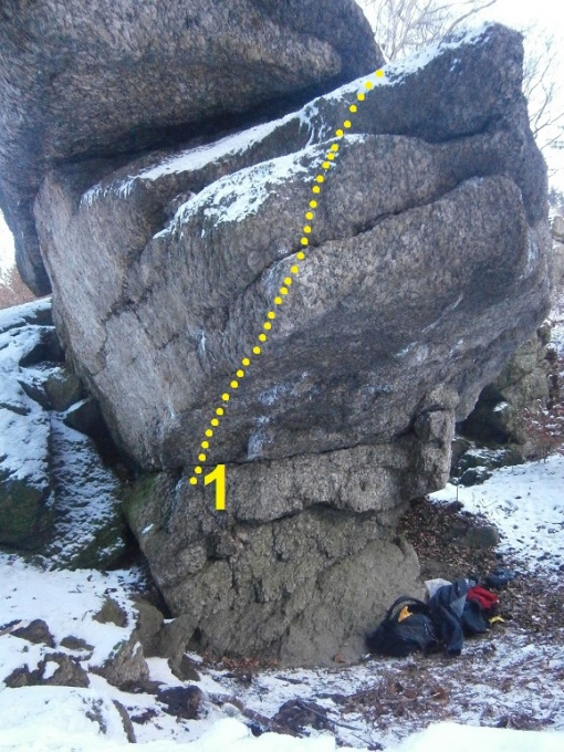 SD, z velkého chytu pod převisem. Po převislé hraně navrchol.