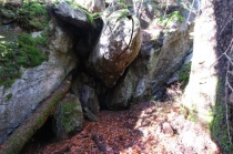 Start s nohama vpravo na spodním kameni, převislá medvědice a ručkování na vrchol.