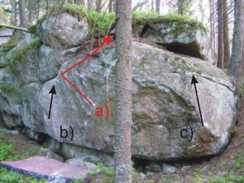 SD, start z největšího chytu pravá, levá spoďák hrana, stupy dole na kamenech, dlouhej tah do bočáku a na hranu, výlez v pravo.