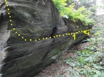 SD, traverz celou trhlinkou zprava - doleva. Na konci výlez nahoru na kámen. Nesmí se používat hrana nahoře. Je to lištovej nářez.