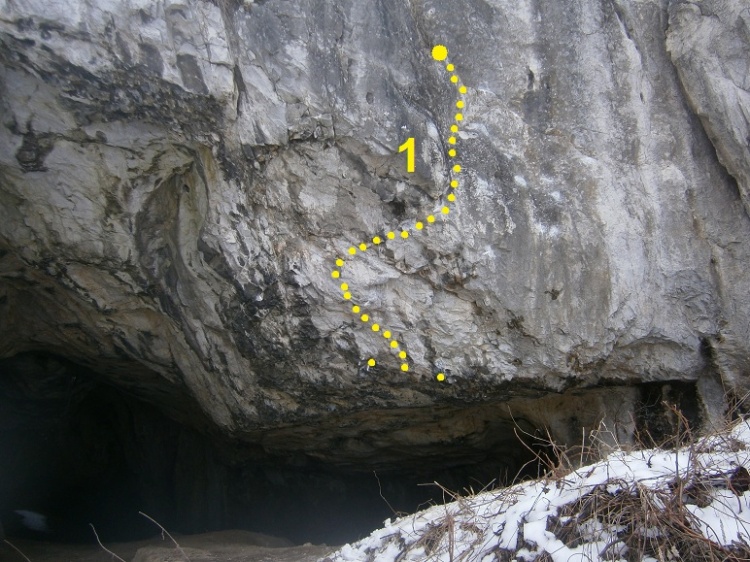 Z dřepu na hraně stropu, z černých teček ( levá spoďák, pravá bočák ) mírně doprava, konec v madle. Velice pěkné a silové lezení na celé tělo. 8A/A+