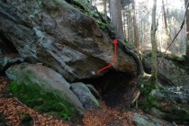 Z dvou chytů pod šipkou doprava nahoru. Z madla ve stropě 6B.