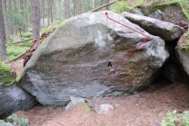 15m za kamenem 3. Na lano. 10m pod modrou turistickou cestou. Malý převislý kámen.