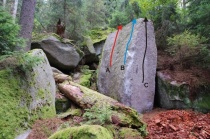 Medvědice z údolní strany.(vpravo od bouldru b) Hezké. Ze stoje 6B.