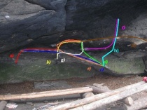 Start jako Ptáci, až do topového madla, poté po hraně až do Momentu(pokračování bouldru na fotce E) MEGA převis - značeno hnědou barvou).