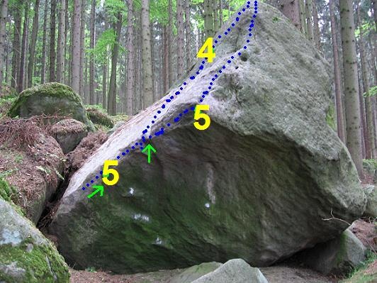 5. Hadí Procházka [6C] Autor: Herbik 12.4.2007 Nástup ze stoje, v levém rohu údolní stěny,traverz po šikmé hraně až na zlom hrany,a pak přímo n.v. V traverzu nepoužívat velkou díru z bouldru Hadí Oko...