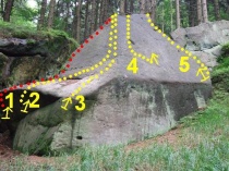 Ze stoje, z lišt vzhůru do dírky před hranou a na vrchol, nesmí se levá hrana.