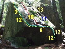 Ze stoje, nástup pod šipkou z obliny, traverz doleva na hranu a z ní nahoru.
