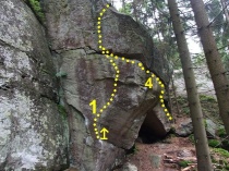 SD, Nástup Poetickou Hranou a poté rozpažkou do horizontální spárky a dále až do boulderu Já O Koze, On O Voze a jím n.v.