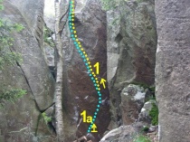 SD, přes malé lišty do dobrých chytů a pak pokračování 7Ačkem... Pozor na dotyk o skálu za zády, dbát na čistotu přelezu.