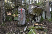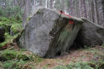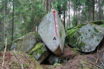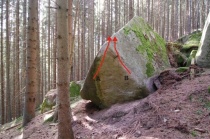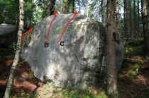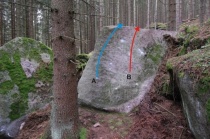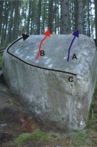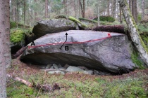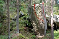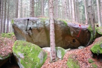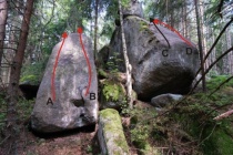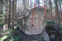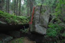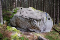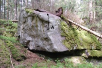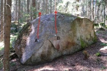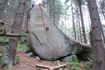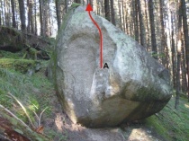 Vpravo od bouldru c) mírným vhloubením.Těžký zdvih, oblina a na hranu.