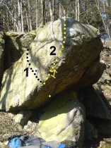 SD, start pravačka bočák - žlutá tečka, levá za hranou v liště - modrá tečka, a po převislé hraně přes oblinu n.v. Pouze po jednom kameni, okolní jsou zakázaný.