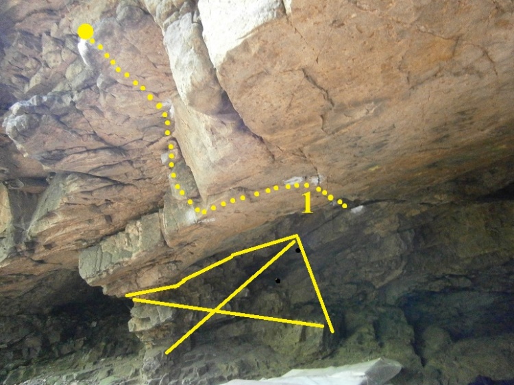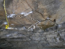 Ze stoje, v pravé částí jeskyně, jasnou linií po hraně stropu, konec v madle metr nad stropem.