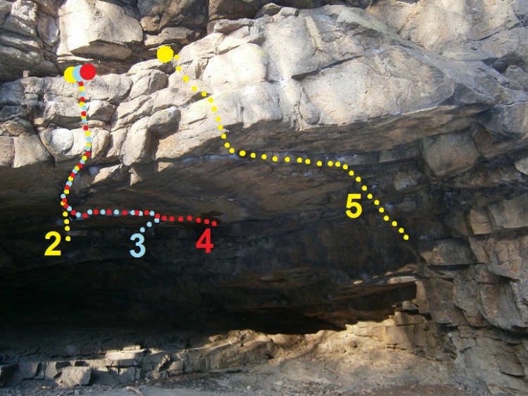 Ze stoje ze dvou velkých madel nahoru do bočo-spoďáku a doleva do oblé police, pravou přískok do bočáku, pak pokračovat boulderem Doping až do topovýho madla. Bez bočáku vlevo dole! Je hned nad nástupovou policí Dopingu.