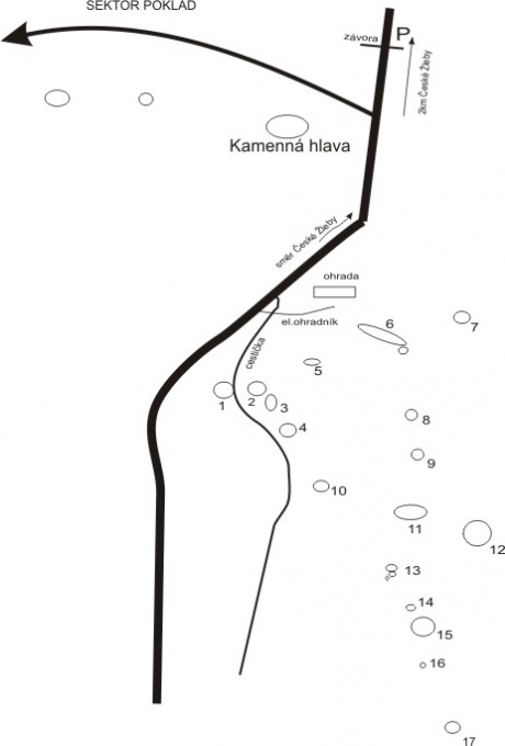 přístup z Českých Žlebů po turistické značce (žlutá) až na rozcestník "KAMENNÁ HLAVA". U ohrady přes el. ohradník po polní cestě asi 100m k prvním kamenům (1,2,3.....)