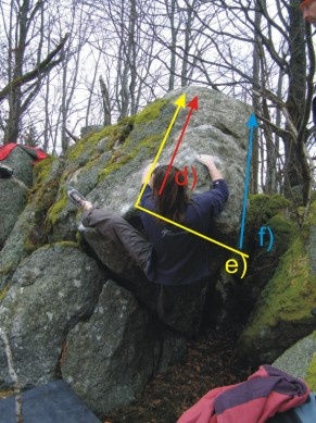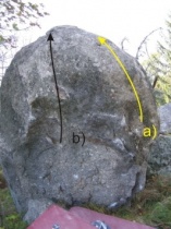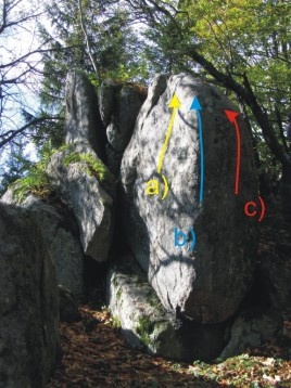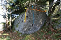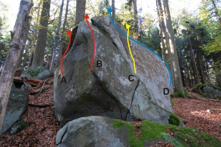 Start bouldrem b). Traverz bez horní hrany. Konec vpravo za stromem. Jen s 2. malými lištičkami pod horní hranou