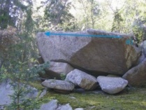 Boulder je na kameni zasunutého vlevo pod Delfínem. Start na hraně, křížem do lišty a vpravo na vršek. Technické.