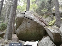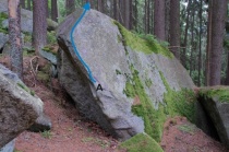 start z lišty a doleva do hrany, poté přes ní a pomocí spodáků do modrého bouldru