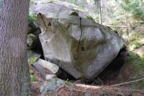 Na fotce to vypadá příliš blízko- v reálu je pěkný, logický bouldr po mikroboulích a pak do výrazné lišty. Bez kamenů dole.