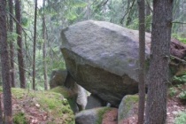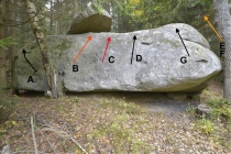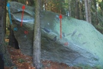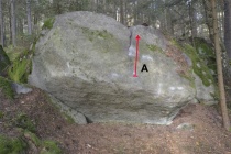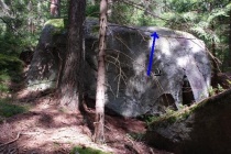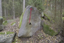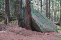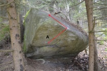 Kámen se náchází 100m pod Podcestným. Hned u plotu obytných chat. Všechny bouldry mají stejný výlez.