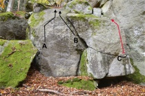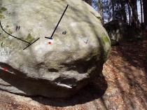 Začatek z polostoje z výrazné lišty Pitoreskna, pak traverz přes obliny až do madla bouldru Bakšiš. 7B/7B+.